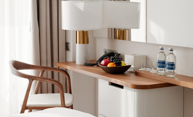 Стандартный однокомнатный номер рассчитан на два основных места. В номере есть мебель: вешалка, зеркало, односпальные кровати (или одна двуспальная кровать), прикроватные тумбочки, стол, стулья и шкаф.