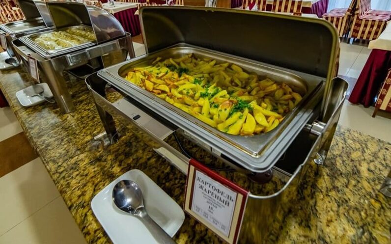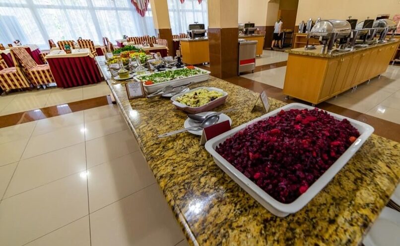 Меню включает мясные и птичьи блюда, разнообразные крупы и овощи, свежую зелень, а также фруктовые и овощные нарезки. Гости также получают минеральную воду и кислородные коктейли.